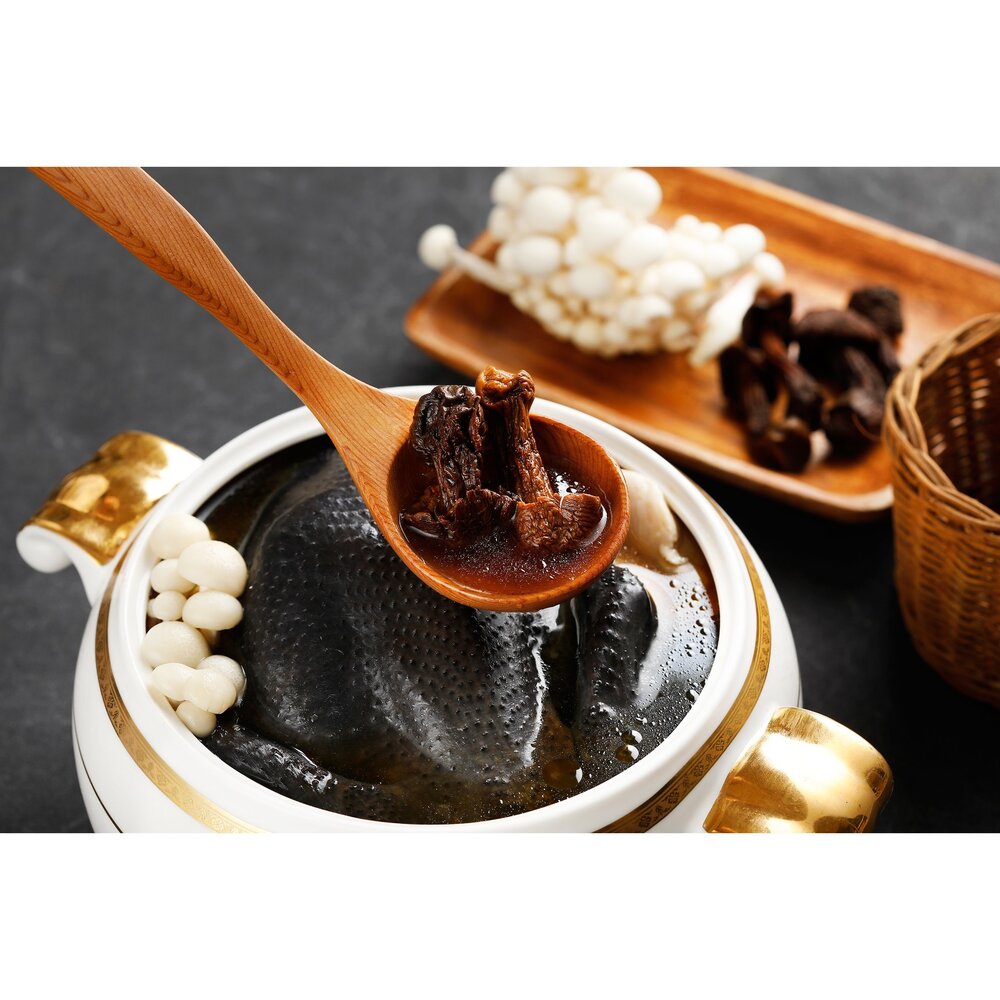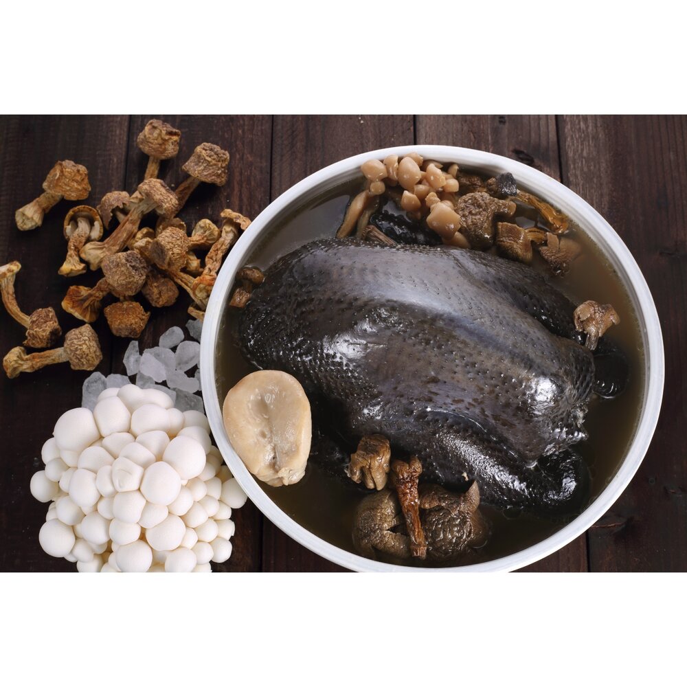 嚴選正宗台灣烏骨雞,加上巴西蘑菇、美白菇、南美貝等精心調理而成