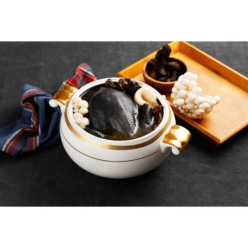 台灣烏骨雞全雞精燉,搭配美白菇、南美貝等豐富食材,特選脆嫩姬松茸共同燉熬,蕈香獨特,增添湯頭的鮮甜層次。肉質軟嫩入口即化,湯鮮味美。